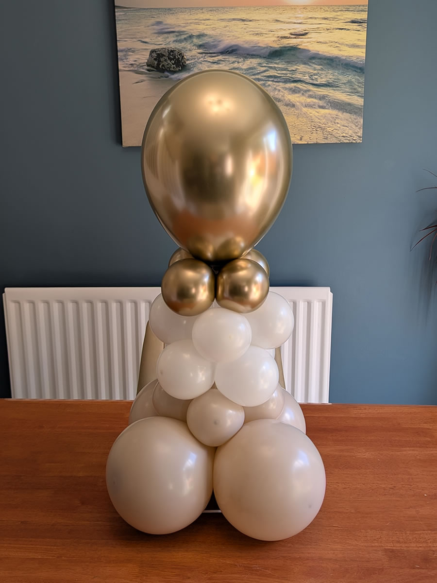 These consist of 10x helium balloons arranged in a 4,3,2,1 pyramid style pattern from floor upwards. So 4x helium balloons at the bottom, then 3x, then 2x with a single helium balloon at the top.