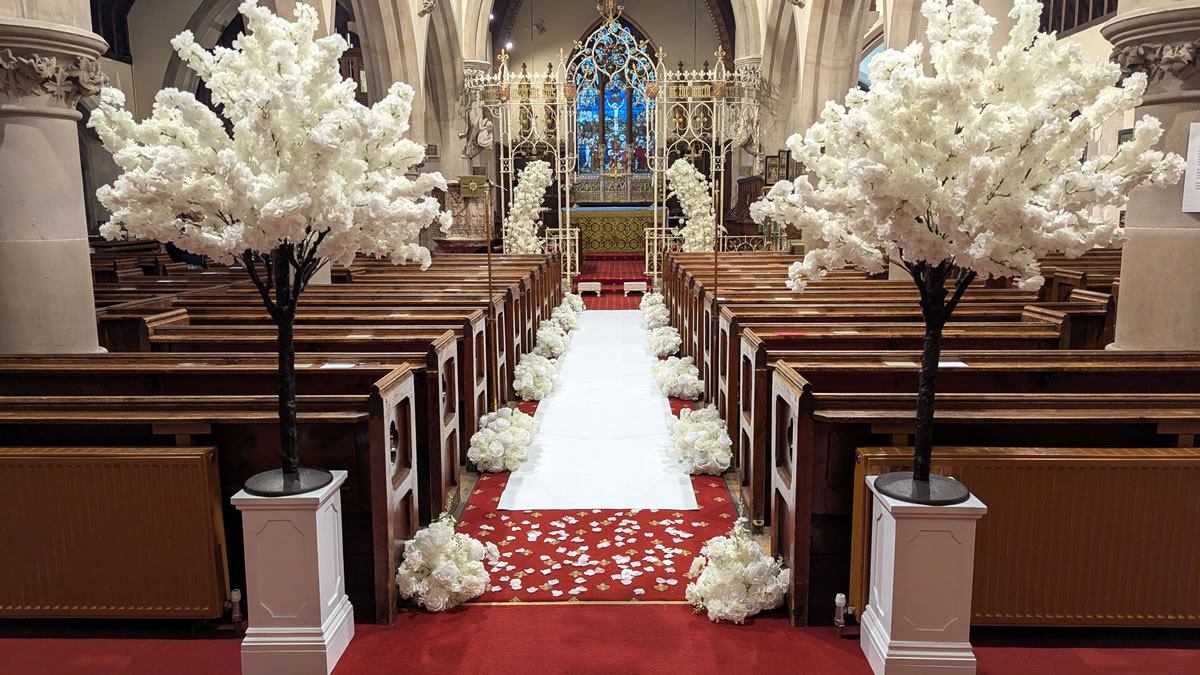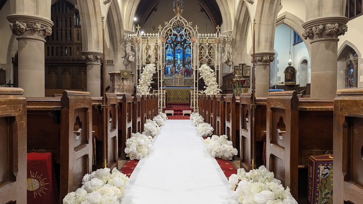 It was a first time visit to St Margaret’s Church, but it certainly didn’t disappoint. With a large stained glass window front and central to the aisle, which was the perfect backdrop to my white & ivory half arches and flower aisle runners with white carpet aisle runner.
